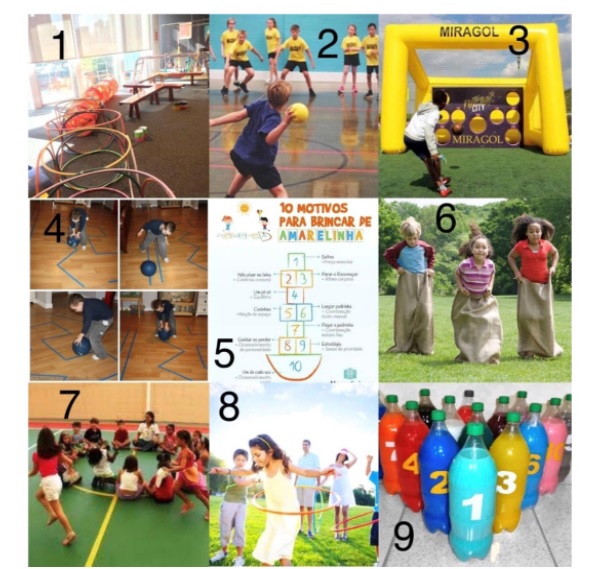 1-CIRCUITO; 2-QUEIMADA; 3-MIRAGOL; 4- ANDAR NA LINHA; 5-AMARELINHA; 6- CORRIDA DO SACO; 7-CORRE COTIA; 8-BAMBOLÊ; 9-BOLICHE.