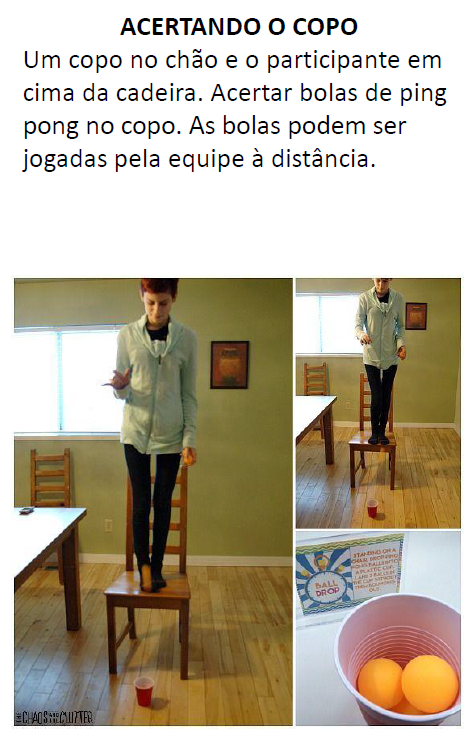 Boa semana para todos, o desafio é: Acertando o Copo. Não perca o equilíbrio. Essa brincadeira pode ser individual, o importante é brincar e se divertir nessa quarentena! Se puder, desafie alguém de sua família. Envie fotos e vídeos curtos para seu professor no Whatsapp.