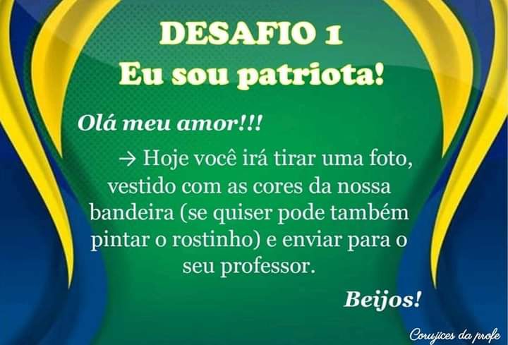 Olá Turminha tudo bem? Espero que sim! Aproveitando a Semana da Pátria (ver o vídeo anexo) faça o desafio da semana e mande para nós por foto ou vídeo curto. Viva o Brasil! sempre juntos!